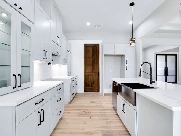 The open concept kitchen allows for easy hosting and family time together for meals. Specialty kitchen countertops, tile backsplash, stainless fixtures and custom cabinets all compliment the neo-ranch style.
